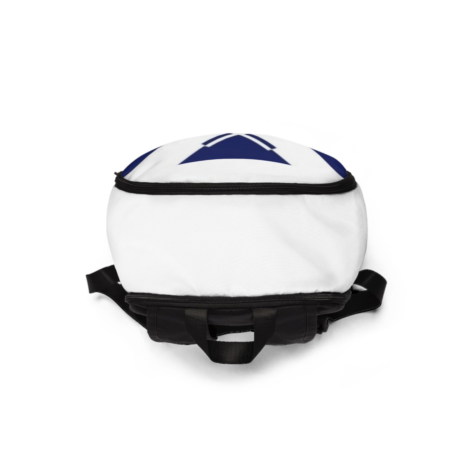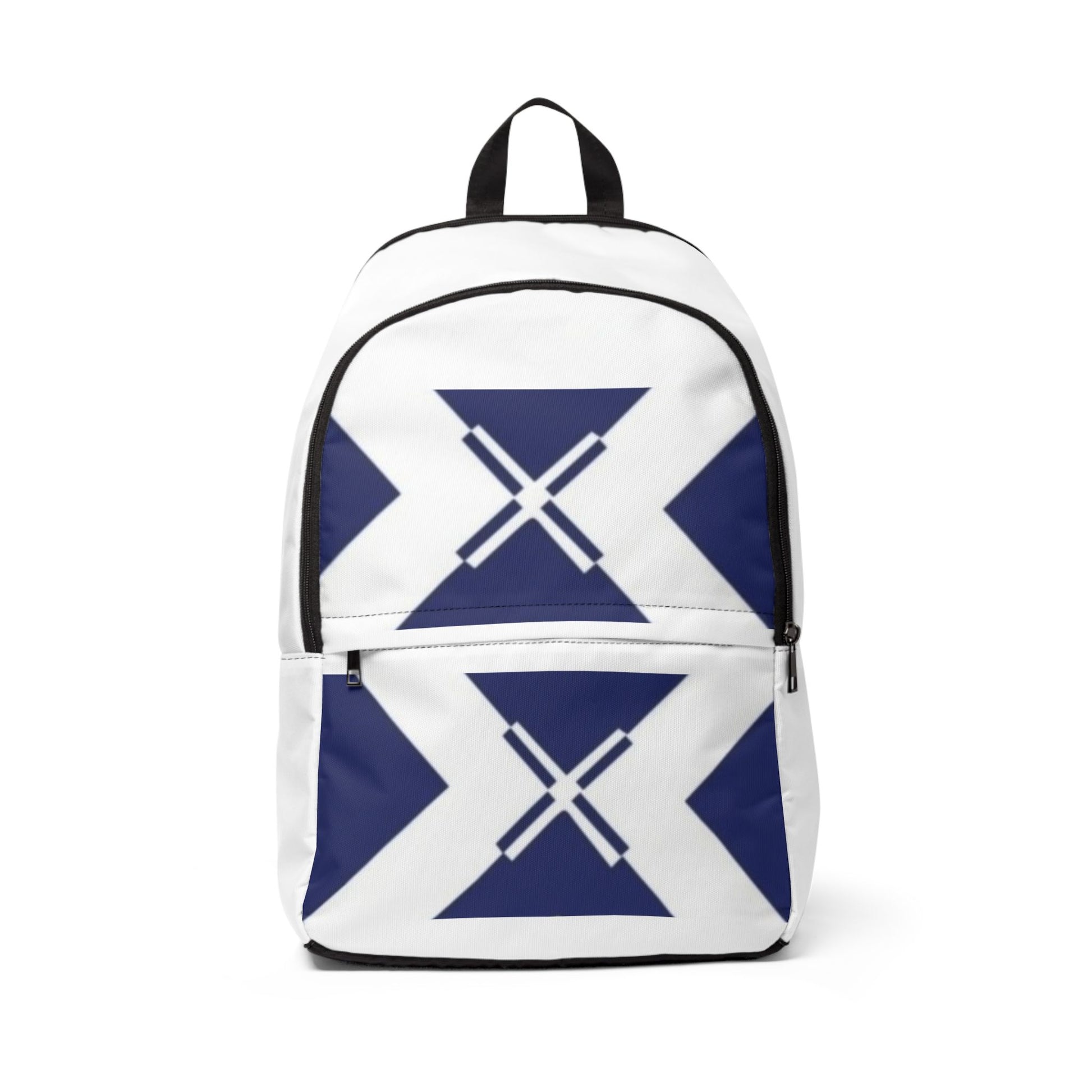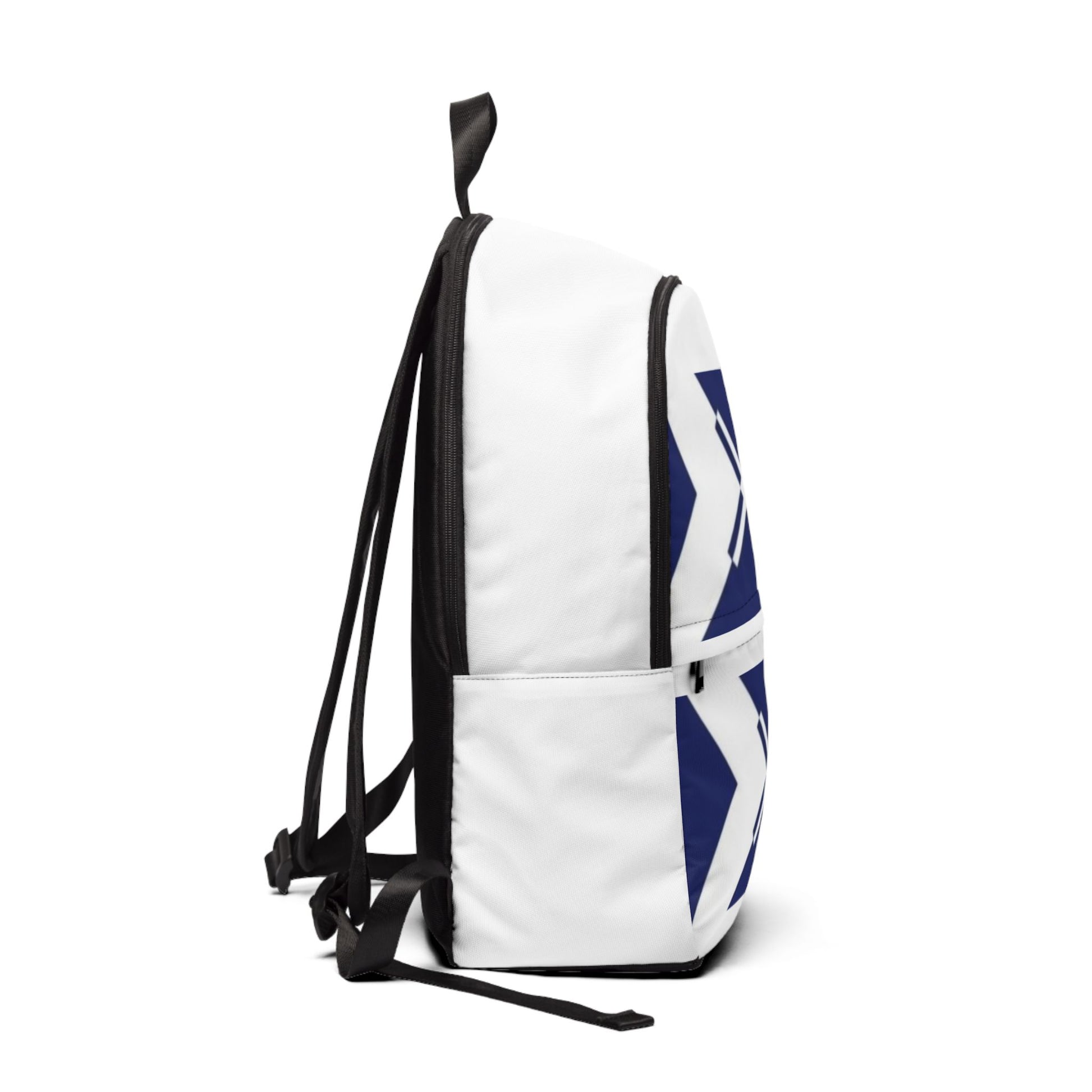 Carry a clean, modern statement with this lightweight fabric backpack. The bold navy geometric motif on crisp white nylon canvas reads minimal and graphic — great for city streets, campus corridors, or quick weekend outings. Padded mesh on the back and straps keeps your shoulders cool during long walks, while three zip compartments make it simple to organize daily essentials. The water-resistant, tear-resistant construction stands up to rain and commuting, yet the pack remains comfortably light. It slides into everyday routines: stashing a laptop for a lecture, holding sketchbooks for an outdoor session, or keeping travel essentials close on a short trip.