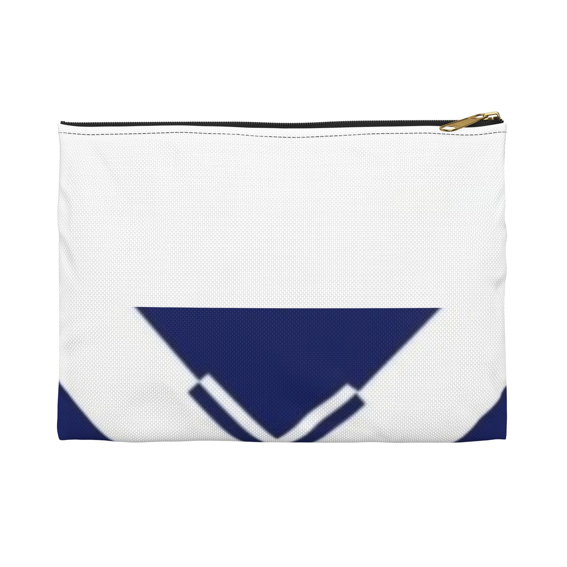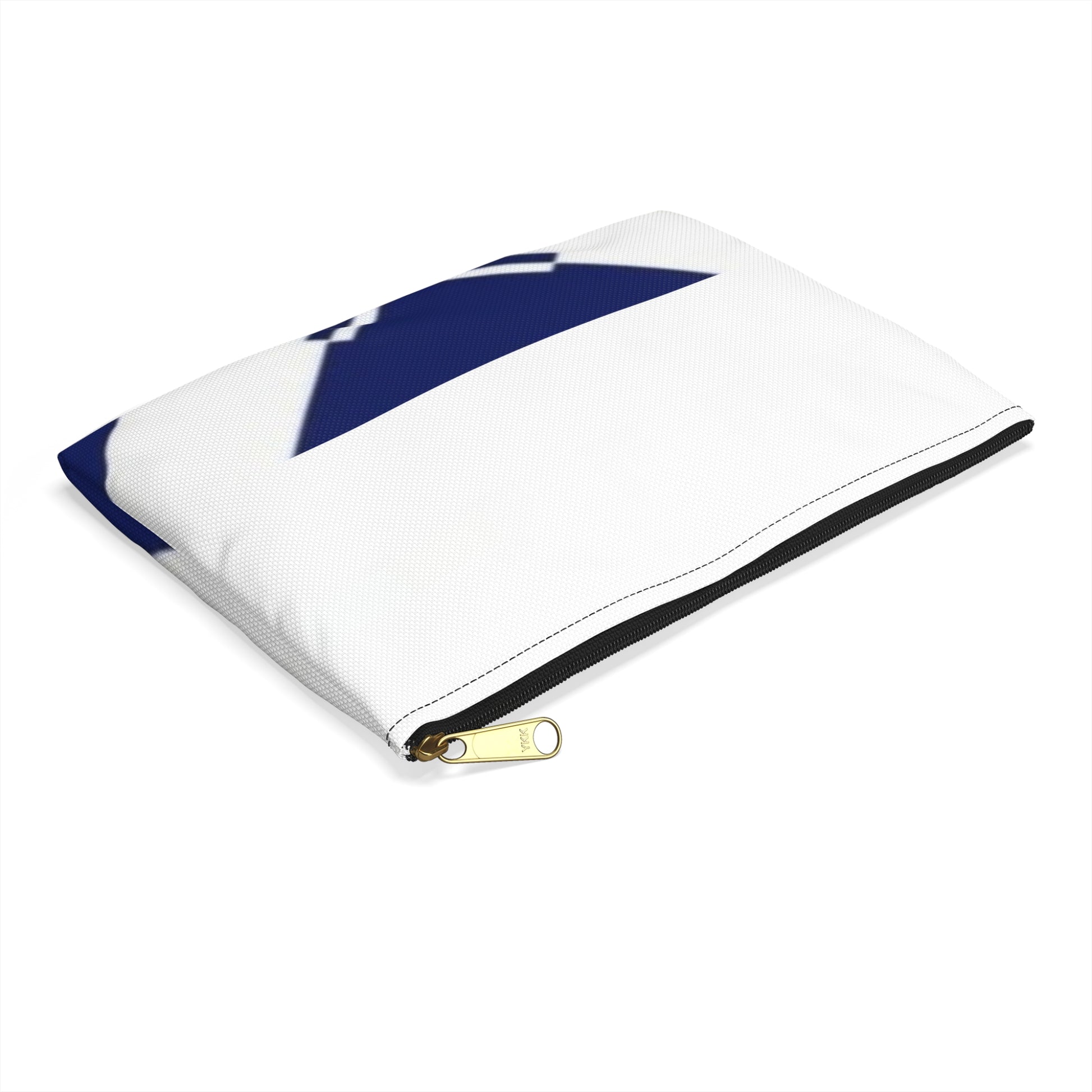 A clean, modern accessory pouch that carries daily essentials with quiet confidence. The bold navy geometric motif rests against a crisp white background, giving the pouch a minimalist, architectural feel. Lightweight yet structured, it slips easily into a tote or backpack and keeps small items—chargers, cosmetics, cards, and keys—organized. The gold-tone zipper adds a small, elegant contrast while the durable spun polyester resists wrinkles and keeps the print vivid through regular use. Thoughtful interior lamination adds subtle structure and easy maintenance, so this pouch looks sharp at your desk, in your studio, or on the go.