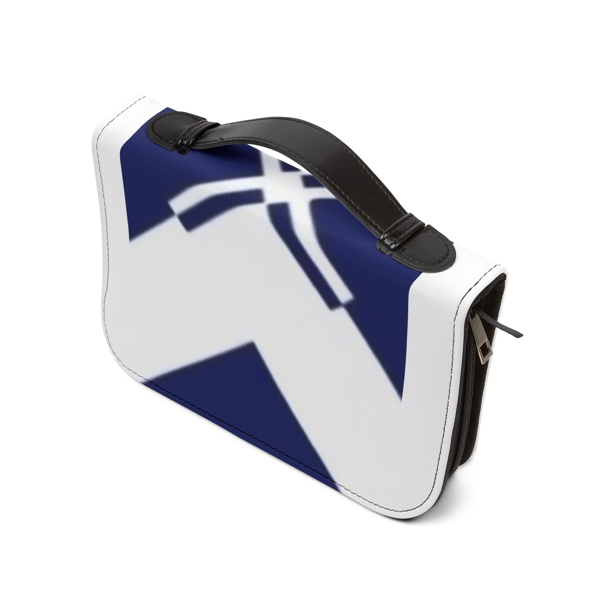 Wrap your Bible in something that feels both modern and reverent. This PU leather Bible cover brings a clean, graphic look with bold navy chevrons on a crisp white field. Padded and zippered, it keeps pages secure during travel, study, or weekly services. Inside, thoughtful compartments hold pens, notes, bookmarks, and small devotional items so your essentials stay organized. The black handle and zipper give a sharp contrast for easy carrying, while the soft faux-leather exterior wipes clean and wears well over time. Recommend sizing up for a comfortable fit with thicker or larger-format Bibles.